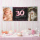 Bannière de fête d'anniversaire de marque avec un arrière - plan noir tendance, 2 grandes photos, parties scintillant rose étincelante, 30 ballons d'hélium rose, et un modèle de célébration personnalisé facile à personnaliser.