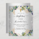 Un faux arrière - plan argenté décoré de verdure d'eucalyptus et de feuilles dorés et de parties scintillant faux argentés brille. Une croix d'or. Personnalisez et le nom de l'enfant et les détails de la cérémonie.