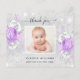 Une carte de remerciements simple et élégante avec photo. Un arrière - plan métallique à l'aspect faux argent, un cadre blanc, de la poussière de parties scintillant faux, des roses violets, des fleurs. Une croix d'or. Personnalisez et ajoutez une note de remerciement, la photo des petites filles et le nom. Texte noir.