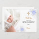 Une carte de remerciements de baptême moderne et élégante. Un arrière - plan blanc chic décoré de fleurs bleues et blanches, de fleurs et d'une croix dorée. Personnalisez et ajoutez votre photo de l'enfant, merci note et nom.