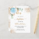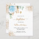 Un arrière - plan blanc décoré d'une végétation d'eucalyptus, un rose bleu clair, des feuilles dorés et une parties scintillant en faux or tombent. Personnalisez et le nom des enfants et les détails de la cérémonie. Lettres noires et dorées. Retour : arrière - plan blanc avec gouttes de parties scintillant en faux or
