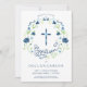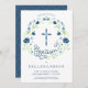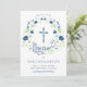 Cette carte d'invitation Baptême ou Christening 5"x7", moderne et tendance, présente une croix bleue entourée d'une couronne florale et le mot "Baptême" écrit dans une police élégante. Idéal pour l'occasion religieuse spéciale de votre bébé garçon, il peut être customisé à votre goût avec le nom de votre enfant et l'information de l'événement.