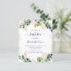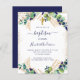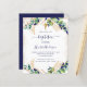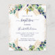 A l'avant : un arrière - plan blanc décoré de verdure d'eucalyptus et de feuilles dorés et de parties scintillant en faux or scintillent. Une croix d'or. Personnalisez et le nom de l'enfant et les détails de la cérémonie. Texte bleu. Retour : arrière - plan bleu marine.