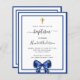 Une invitation moderne, élégante et baptisée. Un arrière - plan blanc décoré de cadres et d'arcs bleu roi. Personnalisez et ajoutez un nom et des détails. Lettres de couleur noire.