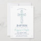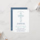 Ce invitation moderne baptisme ou baptême présente une élégante croix florale bleue et verte dessinée. Idéal pour la célébration religieuse d'un petit garçon, il peut être customisé avec le nom de votre enfant et les détails de l'événement. La couleur arrière - plan peut également être changée à votre goût.