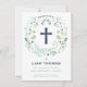 Ce joli et élégant baptême, invitation à baptiser, présente une couronne florale illustrée avec le mot "baptême" encerclant une croix. La couleur du texte, la police et le message peuvent être changés à votre goût. L'arrière de l'invitation est muni d'un arrière - plan bleu/vert (qui peut être échangé sur n'importe quelle couleur de votre choix) avec un motif en quatrefoil blanc.