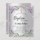 Une invitation moderne, élégante et glamour pour un baptême célébrant une petite fille. Un arrière - plan faux argenté avec parties scintillant violette, étincelants, fleurs de lavande, fleurs et végétation d'eucalyptus. Le nom est écrit avec un script de style moderne écrit à la main. Personnalisez et ajoutez vos détails.