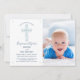 Ce baptême moderne, baptême, baptême, et première invitation d'anniversaire, présente une élégante croix florale illustrée de bleu et blanc ainsi qu'une zone photo. Une façon simple et rapide pour les invités invitations de se joindre à la célébration religieuse d'un garçon et à l'anniversaire de jalon, il peut être customisé avec le nom de votre enfant et des informations personnelles. La couleur arrière - plan peut également être changée à votre goût.