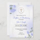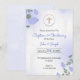 A baptism and christening invitation with a floral design. Features delicate purple and green leaves, a gold cross, and elegant script text.