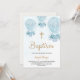 Baptism invitation with blue hot air balloons and gold cross. Features elegant script text announcing a ceremony, set on a light marble background.