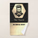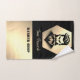 Cette serviette de coiffure professionnelle offre une présentation professionnelle, élégante et tendance de votre entreprise avec ce logo noir et or avec un homme barbu aux cheveux ondulés, suivi de votre nom d'entreprise/personnel.