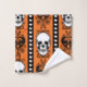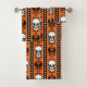 Ce design gothique est orné d'un motif rayé orné d'ornements baroques, de crânes et de coeurs dans un schéma de couleurs noir et orange d'Halloween.