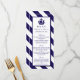 Ces cartes de menu sont parfaites pour tous les couples qui souhaitent un mariage romantique en bord de mer. Le design est orné d'un motif blanc marine bleu navire sur une marine nautique et un arrière - plan rayé blanc. Le design simple peut être personnalisé pour votre événement spécial et sera le menu parfait pour toute soirée nautique sur la plage, y compris : douches nuptiales, fiançailles, wedding showers, fêtes d'anniversaire et bien plus encore.