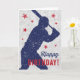 Carte Joyeuse d'anniversaire sur le thème du baseball avec une silhouette bleu foncé d'un garçon tenant une chauve-souris entourée d'étoiles rouges sur un arrière - plan de balle usé.