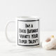 Drôle slogan sur une tasse de café qui dit "Je suis un bassiste guitariste. Quel est VOTRE super talent ?" Café Mug pour un bassiste guitariste ou un bassiste guitariste. Texte en gras noir et blanc.