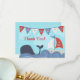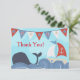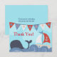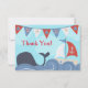 Jolies cartes de remerciement avec une touche nautique. Une baleule bleue nage à la surface des eaux de l'océan avec un voilier dans son sillage. Des fanions festifs pendent au-dessus avec des icônes maritimes comme une boussole, une bouée de sauvetage et une roue de gouvernail. Le recto dit "Merci !" et le verso dit "Merci d'avoir célébré ce jour spécial avec moi !". Personnalisez cette carte avec vos propres sentiments si vous le souhaitez. Elles sont idéales pour dire merci après une baby shower ou un anniversaire sur le thème nautique.