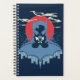 Batman devant une lune rouge avec un nuage de chauves-souris volant de ses épaules et des bâtiments de Gotham City émergeant de sous le logo de chauve-souris sur sa poitrine.