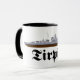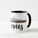 Mug with line drawing of the German battleship Tirpitz of the second world war, sister ship of the Bismarck, with the name of the ship written with fraktur letters.