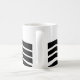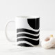 Cette tasse a le design Bauhaus de lignes ondulées et cercles en noir sur un champ de blanc.