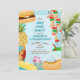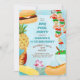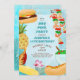BBQ Pool Fête d'anniversaire invitation avec savoureux barbecue nourriture sur un arrière - plan d'eau de la piscine. Le design a un hamburger, hot-dog, pilon de poulet, kebab, maïs sur le berceau, salade bowl, ananas et une boisson. BBQ Pool Party (modifiable) est écrit dans la typographie rétro et le modèle d'invitation est prêt pour vous à personnaliser avec vos détails. Un design d'été amusant - idéal pour jardin barbecue, barbecue familial annuel ou fête d'anniversaire pour petits et grands.