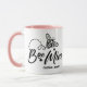 A romantic Valentine's Day mug with play on words pun classic phrases "Be Mine" and "Happy Valentine's Day."