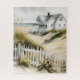 Un puzzle à l'image d'un chalet de plage et de l'océan derrière.