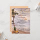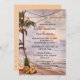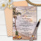 Un billet romantique ou une invitation à la fête de mariage avec une plage tropicale au coucher du soleil avec des lampes à cordes dans les palmiers et un ananas avec des fleurs. Idéal pour une réception uniquement ou une fête après le mariage.