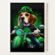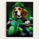 Un ami en fureur derrière les guidons d'une moto verte brillante, portant une tenue verte de la Saint Patrick qui fait tourner la tête. Le chien est habillé d'un ensemble festif, avec une cravate arc-en-ciel verte et un chapeau haut assorti qui se trouve doucement au-dessus de la tête. Le costume présente des motifs complexes de shamrocks et de leprechauns, ce qui indique clairement que ce chien est prêt à célébrer la Saint Patrick avec style.