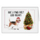 Un beagle mignon est plein d'humour en tenue de Noël. En regardant à côté d'un arbre de vacances, il laissa des empreintes de pattes boueux. "Paws" et envoyer une carte de Noël de vacances amusante avec des voeux pour un Nouvel An humoristique.