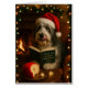 Humorous Christmas card featuring a Bearded collie dog reading 'The Cheese Tax at Home Regulations 2025' whilst trying to resist the urge to eat the cheese that someone's left on the table right in front of its nose!