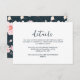 Belle carte de détails mariage bleu foncé et rose vif avec fleurs roses foncées sur un arrière - plan bleu foncé, et devant blanc avec typographie de script bleu tendance.