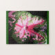 Joli caladium rose avec une gouttelette d'eau du matin de mon jardin. Puzzle amusant.