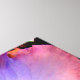 Cette toile présente une photo d'une très belle pêche et d'iris violet.