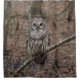Un beau hibou barré est été perché sur une branche d'arbre à l'intérieur d'une forêt "brune" sèche pendant l'automne. Regardez comment il se tient dans cette salle de bains blanche ! Grande idée de cadeau d'amants de hibou pour leur maison ! Huée !