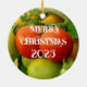 Une photo de beaucoup de tomates cerises rouges est imprimée sur le devant de cet ornement avec des tomates cerises vertes et rouges sur la vigne à l'envers avec le texte "Joyeux Noël 2025". Quelqu'un que vous connaissez cultive beaucoup trop de tomates chaque année. Vous aimez juste aller à l'extérieur et vérifier les vignes pour tous les rouges fraîchement mûris. C'est comme une chasse au trésor. Peut-être qu'ils les vendent, peut-être qu'ils les donnent à tous leurs amis, famille et voisins. Cette personne va aimer cet ornement. Ce serait un grand cadeau de l'un de ces amis, membres de la famille ou voisins qui apprécient le producteur de tomates qui partage sa prime.