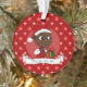 Ornement acrylique avec l'illustration d'un bébé afro-américain souriant mignon tenant un cadeau de Noël et portant un casquette du Père Noël ; dans un cercle rouge sur un arrière - plan rouge avec étoiles, un design de vacances de Noël avec un modèle texte modifiable pour votre nom ou message