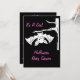 Invitation tous vos invités baby showers avec cette adorable gamme de cartes d'invitation à baby shower thématiques C'est une fille Halloween. Les cartes pour la petite fille offrent une petite chauve-souris pendue à l'envers d'un arbre éffrayant dont l'image est placée sur une couleur arrière - plan noire. Le libellé à l'avant et à l'arrière de la carte a été fixé en rose pour les petites filles et peut être personnalisé avec vos propres informations de fête d'Halloween baby shower. Retourner la carte pour trouver la même adorable image de chauve-souris assise à droite de la carte d'invitation.