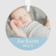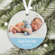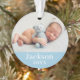 Un ornement photo simple et élégant pour le premier Noël du bébé peut être personnalisé avec une photo de nouveau-né et texte personnalisé pour le prénom. Choisissez d'inclure la même photo sur les deux côtés ou deux photos différentes. La couleur bleue de l'arrière - plan peut être changée pour correspondre à vos photos !