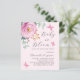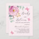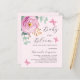 Un arrière - plan rose pâle et doux. Décoré d'une rose rose rose et d'une verdure d'eucalyptus vert aquarelle et de papillons. Personnalisez et un nom et des détails du parti. Texte : Bébé en fleur. 1 feuille = 1 invite imprimé bord à bord.