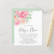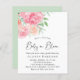 Jolie invitation à l'aspersion de bébé à petit budget avec florale d'aquarelle rose et corail et "Baby in Bloom" écrit dans un script élégant.