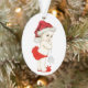 Bébé fille adorable avec un chapeau de Père Noël et un ornement de Noël en forme de flocon de neige. Vous pouvez ajouter du texte au dos de cet ornement de premier Noël de cette jolie bébé fille dans le style de police et la couleur, et la formulation de votre choix. Vous pouvez également changer la couleur de fond de cet ornement de sapin de Noël adorable bébé fille.