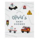 Ce joli panneau d'accueil pour baby shower bébé comprend des illustrations de voiture de dessin animé et de transport, avec une ambulance, voiture de police, et camion de pompier. Il y a aussi de la place pour ajouter le nom de la mère.