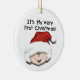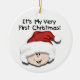 Un bébé habillé d'un casquette de Père Noël et d'un texte de style enfant qui dit "C'est mon tout premier Noël !" sur les premiers ornements de Noël personnalisables.