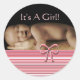 C'est une fille notre Perle Précieuse ! Nouveau Bébé Faire-part Photo Sticker. Motif à rayures roses et violettes avec une jolie corne rose