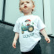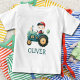 Ce t-shirt personnalisé pour tout-petit représente un garçon fantaisiste sur un tracteur vert mignon.