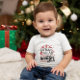 Un mignon T-shirt bébé avec sapin de Noël, rennes et une citation drôle "Trop mignon pour porter un pull moche". Vous pouvez customiser ce design avec le nom de bébé de votre enfant ou de celui de votre proche, ou retirer le nom en cliquant sur le bouton "Personnaliser ce modèle". Un cadeau parfait pour baby shower et anniversaire.