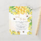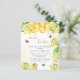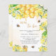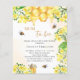 Une jolie invitation au Baby shower avec un arrière - plan blanc et doré à l'eau. Décoré d'abeilles bourdonnantes, de miel fondu et de nid d'abeille aux fleurs jaunes, de fleurs et d'un pot de miel. Avec le texte : Maman to bee. Personnalisez et ajoutez le nom de la mère à être. Lettres dorées et noires. Non sexiste.
