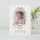 Celebrate your little one's Goose themed first Birthday with this easy to edit template. Featuring a playful wavy bow border with your own custom photo inside. There is a sweet little goose with a black bow on it in the corner, along with 'One silly goose' typography, along with a beige stripy background.