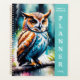 Belle chouette à cornes brune et blanche avec fleurs roses et feuilles verts poussant de la branche sur laquelle il est perché. Dans l'arrière - plan se trouve une forêt brumeuse en gris foncé et bleu. Des gouttes de peinture tombent du bas de l'illustration. Cette belle illustration d'une créature nocturne magnifique est idéale pour tous les amateurs d'oiseaux. Un espace coloré turquoise sur le côté droit pour ajouter votre nom date et le texte à personnaliser.