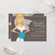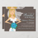 Une belle mariée blonde aux cheveux dorés rêve de son mariage d'être, tenant un bouquet de fleurs bleues de sa mariée, alors que son voile gronde gracieusement dans la brise. Une belle image pour toute célébration de Fête de l'mariée. Texte blanc et bleu sur une arrière - plan mocha moelleuse, ce design moderne de douche est sobre et élégant. Disponible avec des mariées blondes, brunes ou rousses et dans une variété de couleurs.